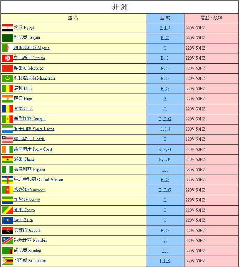 非洲各國插頭形式參考表